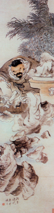不仅书法家的神来之笔会借助于酒力,许多画家的肆意点染、气象万千也是得酒之助。苏轼说:“诗至于杜子美,文至于韩退之,书至于颜鲁公,画至于吴道子,而古今之变,天下之能事毕矣。道子画人物……出新意于法度之中,寄妙理于豪放之外,所谓游刃有余运斤成风,盖古今一人而已。”吴道子性格豪爽,喜欢在酒醉时作画。传说他在描绘壁画中佛头顶上的圆光时,不用尺规,挥笔而成。张彦远在《历代名画记》中,记载他“好酒使气,每欲挥毫,必须酣饮”;在段成式的《西阳杂俎》中,记载了寺院主持以美酒来换取吴道子画的故事。苏轼本人就是一位集诗人、书画家于一身的艺术大师,他也喜爱饮酒,留下很多吟诵美酒的传世诗篇。他的绘画作品往往也是乘酒醉所画,黄庭坚在题苏轼的竹石画诗时说:“东坡老人翰林公,醉时吐出胸中墨。”他还说:苏东坡“恢诡谐怪,滑稽于秋毫之颖,尤以酒为神,故其筋次滴沥,醉余频呻,取诸造化以炉钟,尽用文章之斧斤。”苏东坡酒后所画的正是其心中的世界,别有洞天。明代的风流才子唐伯虎,筑室于美丽的桃花坞,在《桃花庵歌》中自吟道:“桃花仙人种桃树,又摘桃花换酒钱。酒醒只在花前坐,酒醉还来花下眠。半醉半醒日复日,花落花开年复年。……”每当春日,园内花开如锦, 他邀请沈周、祝允明、文徵明等来此饮酒赋 诗,挥毫作画,尽欢而散。祝允明在为唐伯 虎写的《唐子畏墓志铭》中有:“日般饮其中,客来便共饮,去不问,醉便颓寝。”