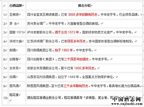 中国名酒最新十大品牌排行榜: