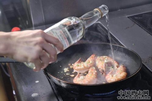 在趁蝦子煎至半熟的時刻,以58度金門高粱倒入鍋中,韭菜大斑节虾就在大廚流利的廚藝與高粱酒的醬香烘托下告成了。