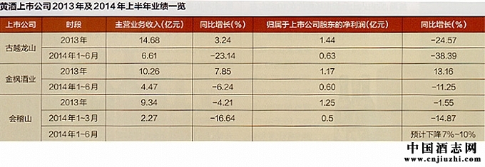 2014年上半年,黄酒行业的调整压力开始全面体现至报表层而。在营业收入和净利润两个业绩指标上,古越龙山、金枫酒业基本呈现两位数下降,而会稽山招股说明书中相关信息显示,2014年1~3月份,公司营业收入和净利润均出现两位数下降,今年上半年净利润预计将下降7%~10%。