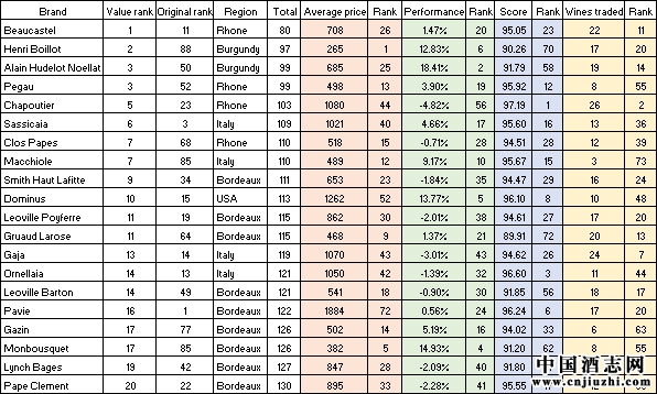 今年20个最强的优质葡萄酒品牌分别来自9个不同地区;这样大的地区范围是出版了九年的100最强中前所未见的。我们决定重整100最强,以图看看哪些是最物有所值的葡萄酒。为了辨认较低价格的买入机会,我们删除所有每箱平均市场价格高于2000英镑的品牌(基于2013年9月至2014年8月之间的葡萄酒交易)。然后,我们根据其平均价格(价格越低,排名越 高)、平均得分、过去一年的表现和葡萄酒的交易数量进行品牌排名。其结果如下表所示。