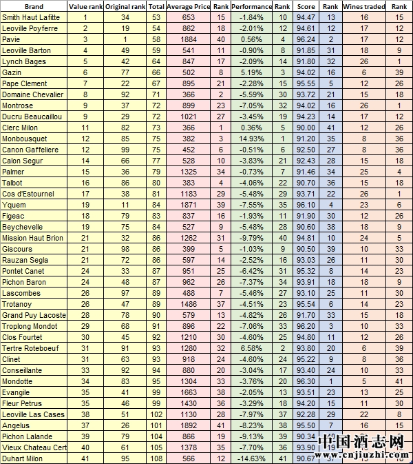 去年在价值品牌排行榜第三名的史密斯拉菲特Smith Haut Lafitte,因其今年全面的优秀表现(相对表中的其它品牌,它的平均价格没有大幅下跌但仍保持较低) ,已攀升至第一名。克莱蒙教皇Pape Clement,因其价格和表现的排名下滑至低于其它品牌,排名由去年的第一位跌到2014年的第七位。右岸Monbousquet,是今年100最强的 新进入者,价格表现突出,涨价达14.9%。相比之下,在名单上价格表现最薄弱的品牌是杜哈米隆Duhart Milon,有14.6%的跌幅。